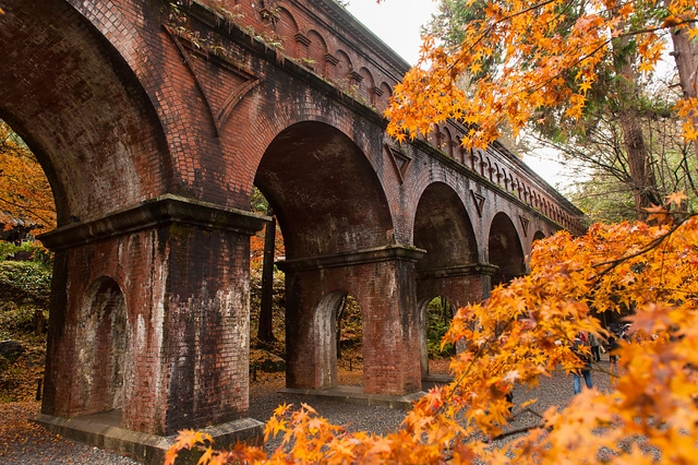 金黃楓葉與水路閣的拱形橋墩,日本京都南禪寺