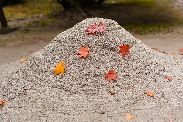秋天紅色的楓葉掉落在日本庭園中的枯山水